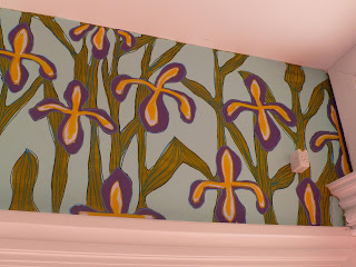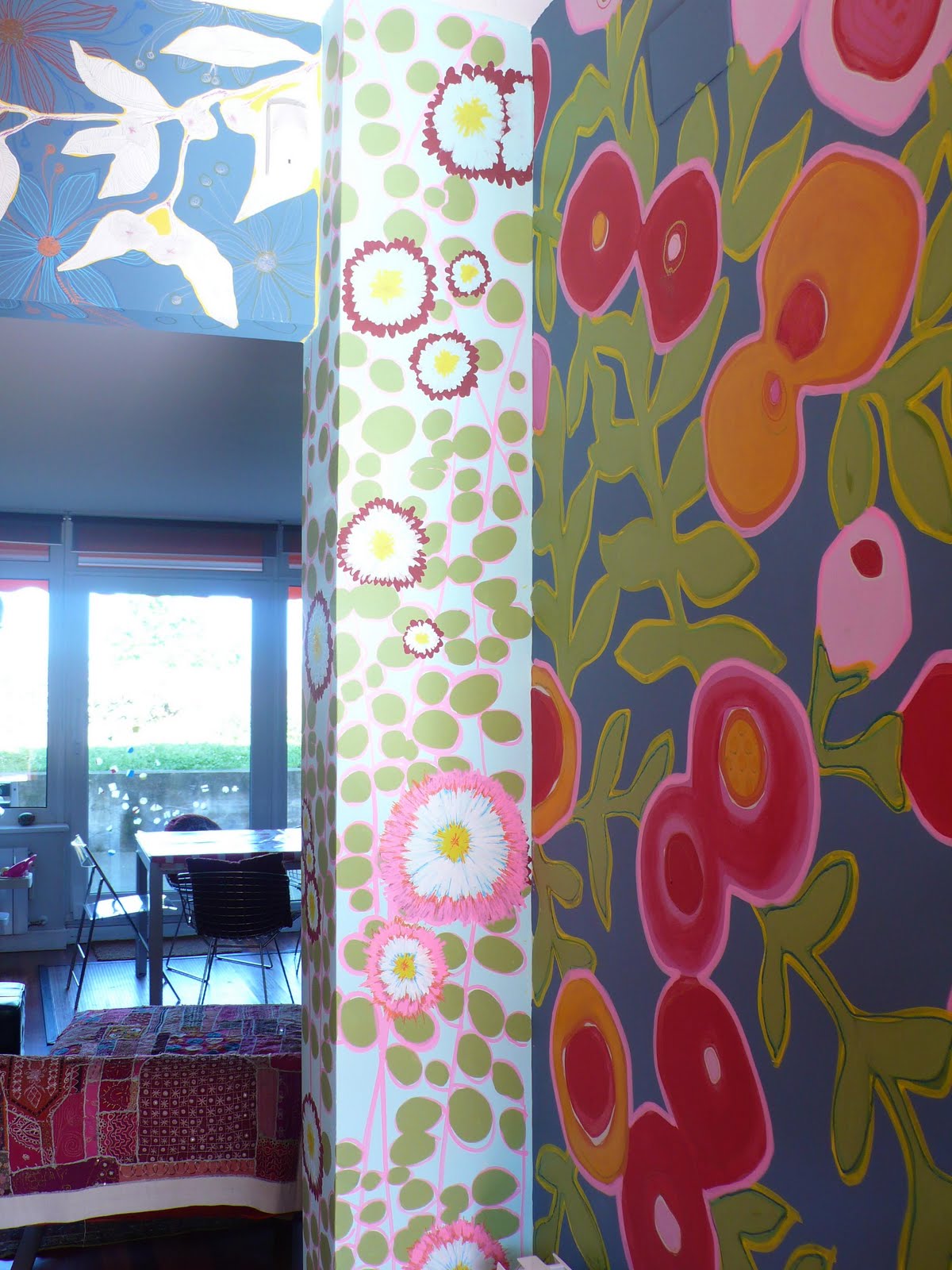 Me apetecía poner un toque primaveral en casa, ahora que parece que se acerca el sol a visitarnos... Empecé por una pared, pero la pasión me llevó a irlo revistiendo todo... Como un gran patchwork de estampados y colores. Quien sabe, quizá siga trepando por las paredes hacia arriba, colgada del pincel,mientras surgen flores, espirales de colores, marañas abstractas...