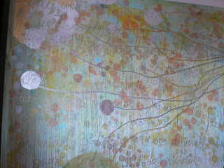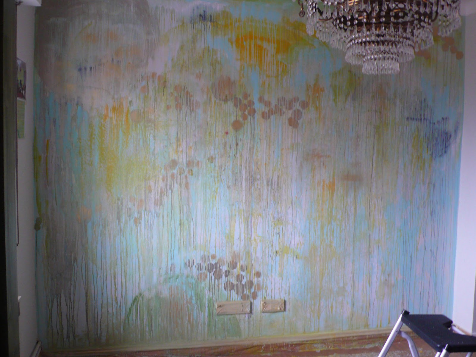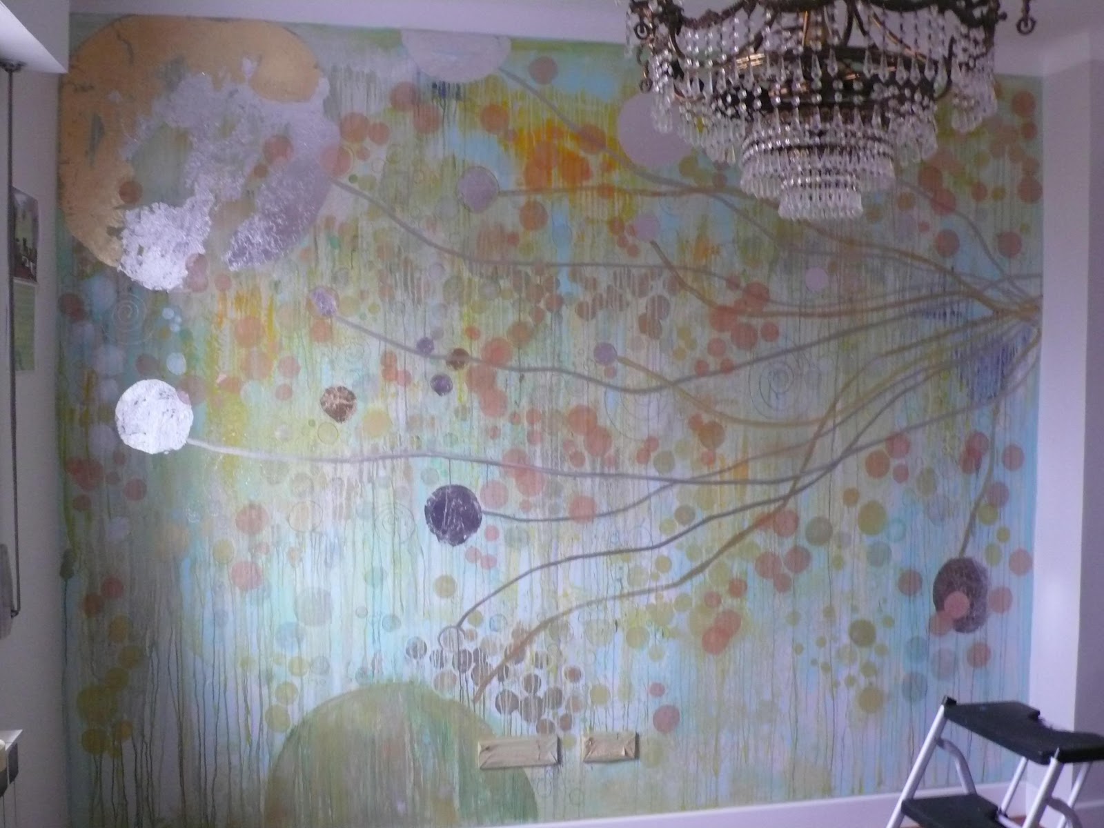 En primer lugar, os presento una serie de fotos sacadas para evidenciar los diferentes estadios de realización del mural. Desde los primeros chorretones y salpicaduras hasta llegar al collage con panes de oro y plata, láminas de nácar, papeles de seda y pigmentos metalizados. Acabamos con líneas de lápiz, grafitos y rotuladores que trazan el texto del poema.